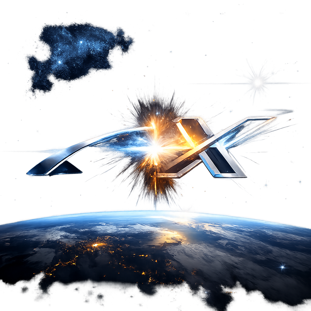 A cinematic shot of a SpaceX Falcon Heavy rocket lifting off into the night sky, overlaid with a glowing blue digital neural network representing xAI. High contrast, professional photography, 4:3